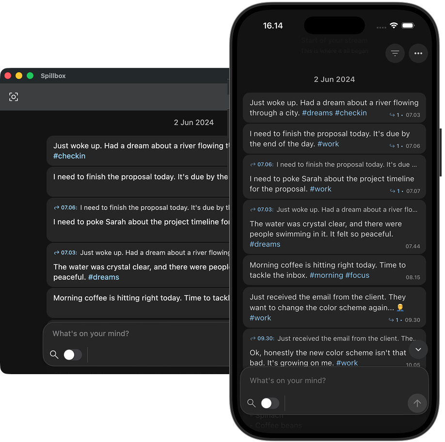 Spillbox.app is a dedicated tool for that exact behavior. It's a local-first stream that gives you the speed of texting yourself, but designed for notes instead of messages, and to safely bridge back to your main workspace when you're ready.